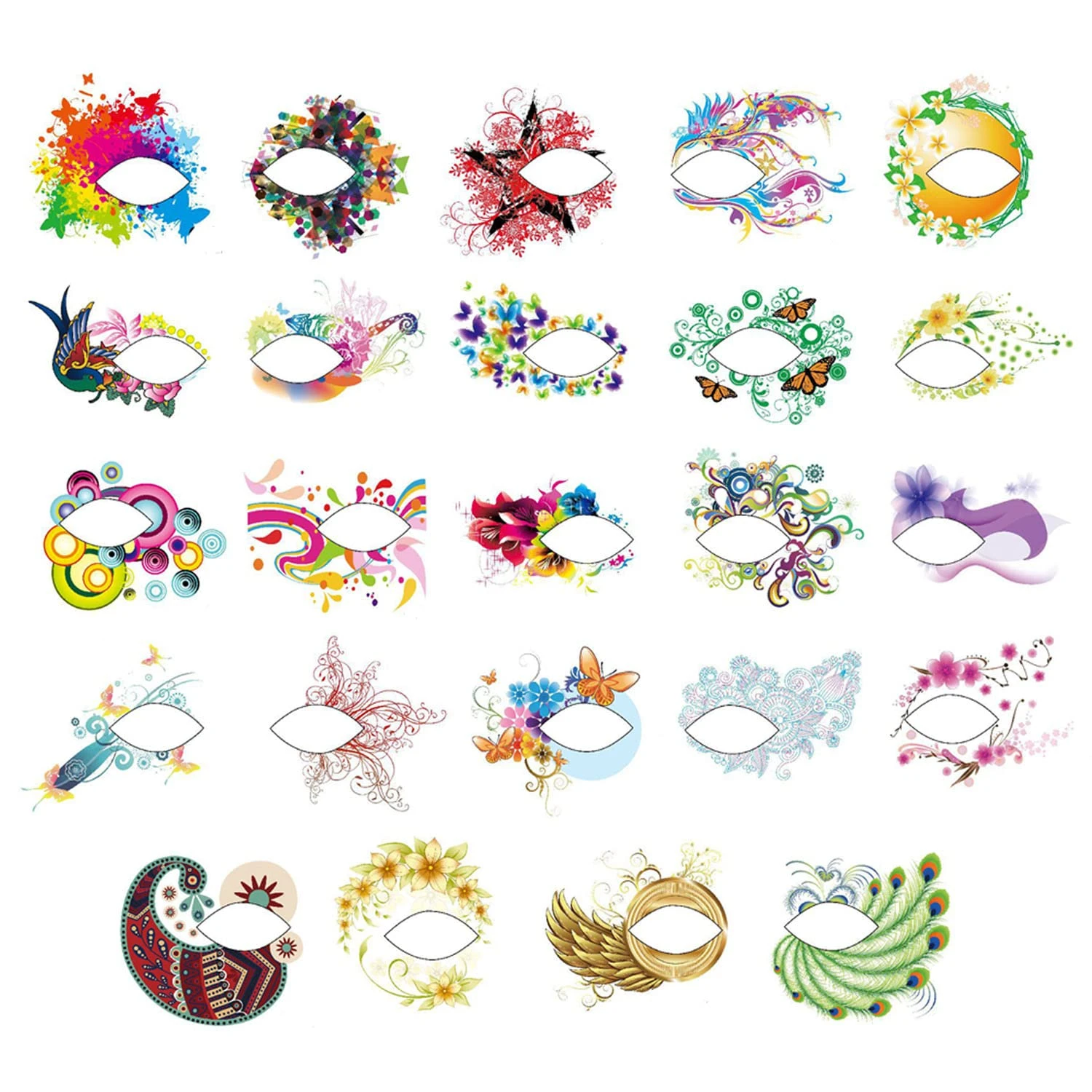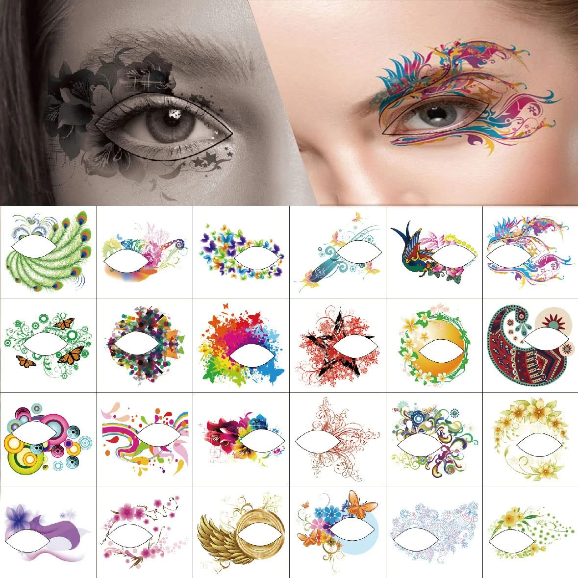 - 24pcs Eye Tattoos: The beautiful tattoo is your secret formula to release your superstar glow. A sets of 24pcs face eyeshadow makeup temporary tattoos in different colors and patterns as pictures show, you can choose them according to your interests. Looks very real and create an amazing look. They stayed on really well, waterproof and sweat-proof.