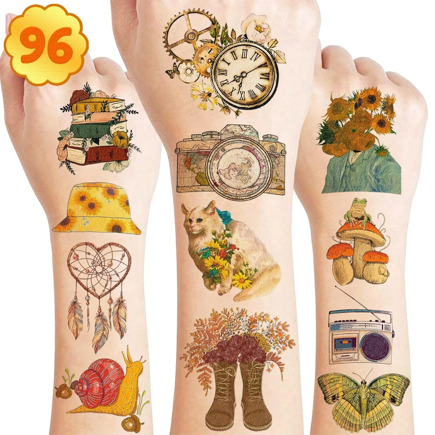 96 PCS Vintage Aesthetic Tattoo Stickers Temporary Tattoos Birthday Party Decorations Favors Supplies Decor Retro Boho Sticker Gifts For Kids Women Adults Girls Boys School Rewards Carnival Christmas
