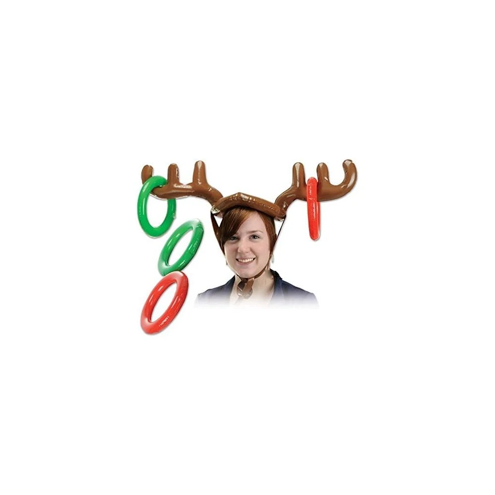 - Features inflatable reindeer antlers with chin strap and 4 red and green toss rings