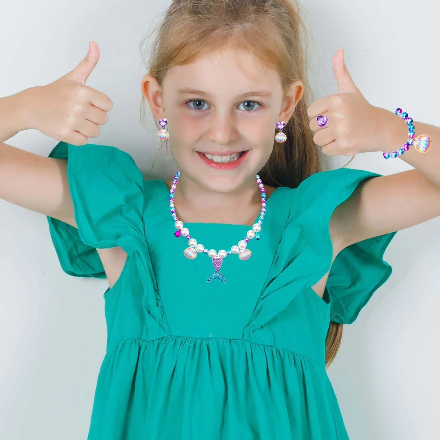- 【Cute design】The perfect combination of blue purple and white pearls, combined with shells and fish tails, creates a beautiful set of mermaid accessories. The necklace and bracelet set features an elastic band design that can be easily adjusted for children to wear. Each shell earring comes with a soft rubber pad to protect children’s ears. The perfect princess costume fulfilled the little girl’s princess dream.