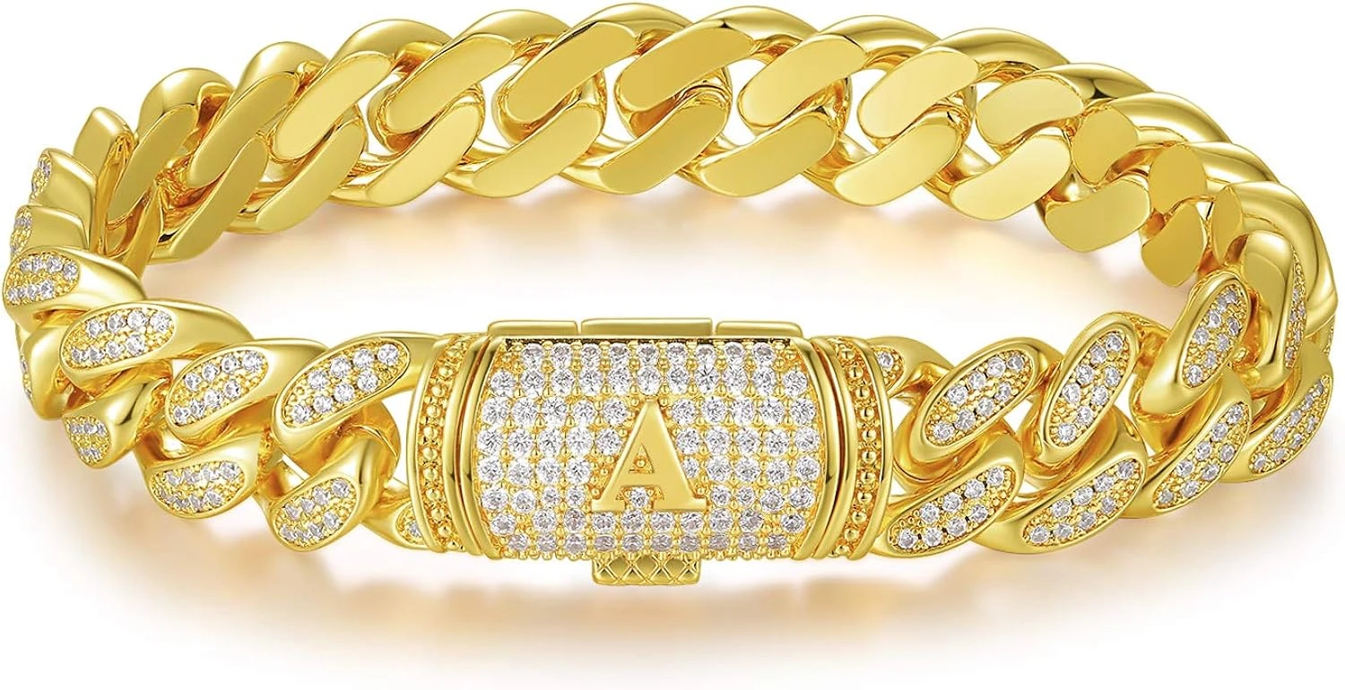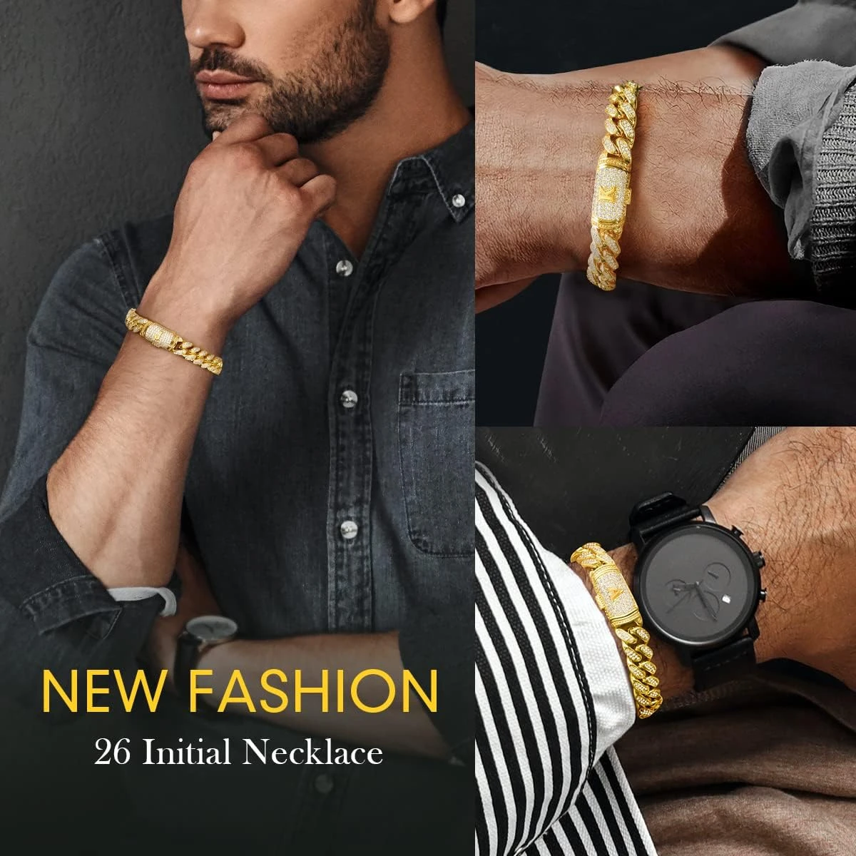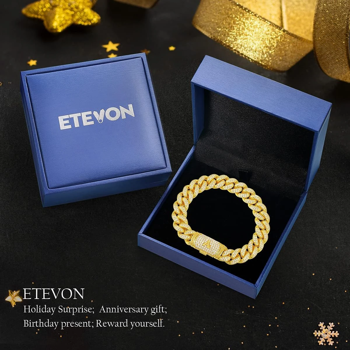 ETEVON Cuban Link Initial Bracelet For Men Gold Plated Hip Hop Mens Jewelry Gift For Boyfriend Birthday Christmas Anniversary Valentines Day Diamond Gold Chain Jewelry Gifts For Men Husband Boy Son Dad