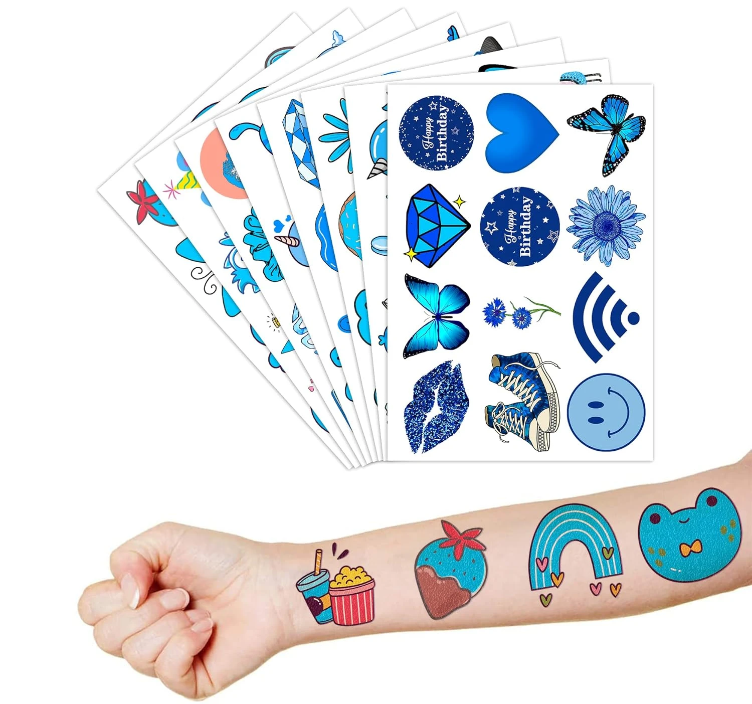 - Blue Party Supplies: 8 Sheets Blue temporary tattoos stickers, Have a variety of themed color, Children can easily Blue stickers and take unique photos to make fond memories. The size of each sheet is 6.1 * 3.1 inches.