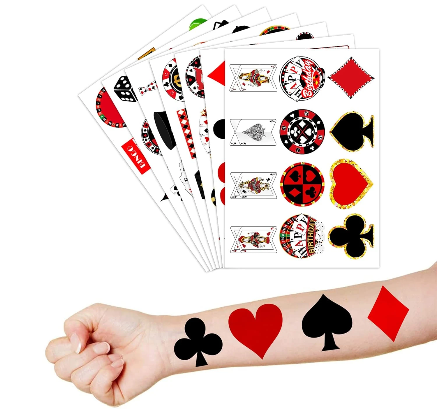 - Casino Party Decoration: The set contains instructions for use and is easy to use. Casino tattoo stickers can be applied on arms, face, hands, neck, shoulders, legs, wrists and ankles to make you look cool at all kinds of parties. Popular hit with your kids. You can apply them to your body or some smooth objects, for example, glass, stationery, paper, crafts cups, cabinet, bottle.
