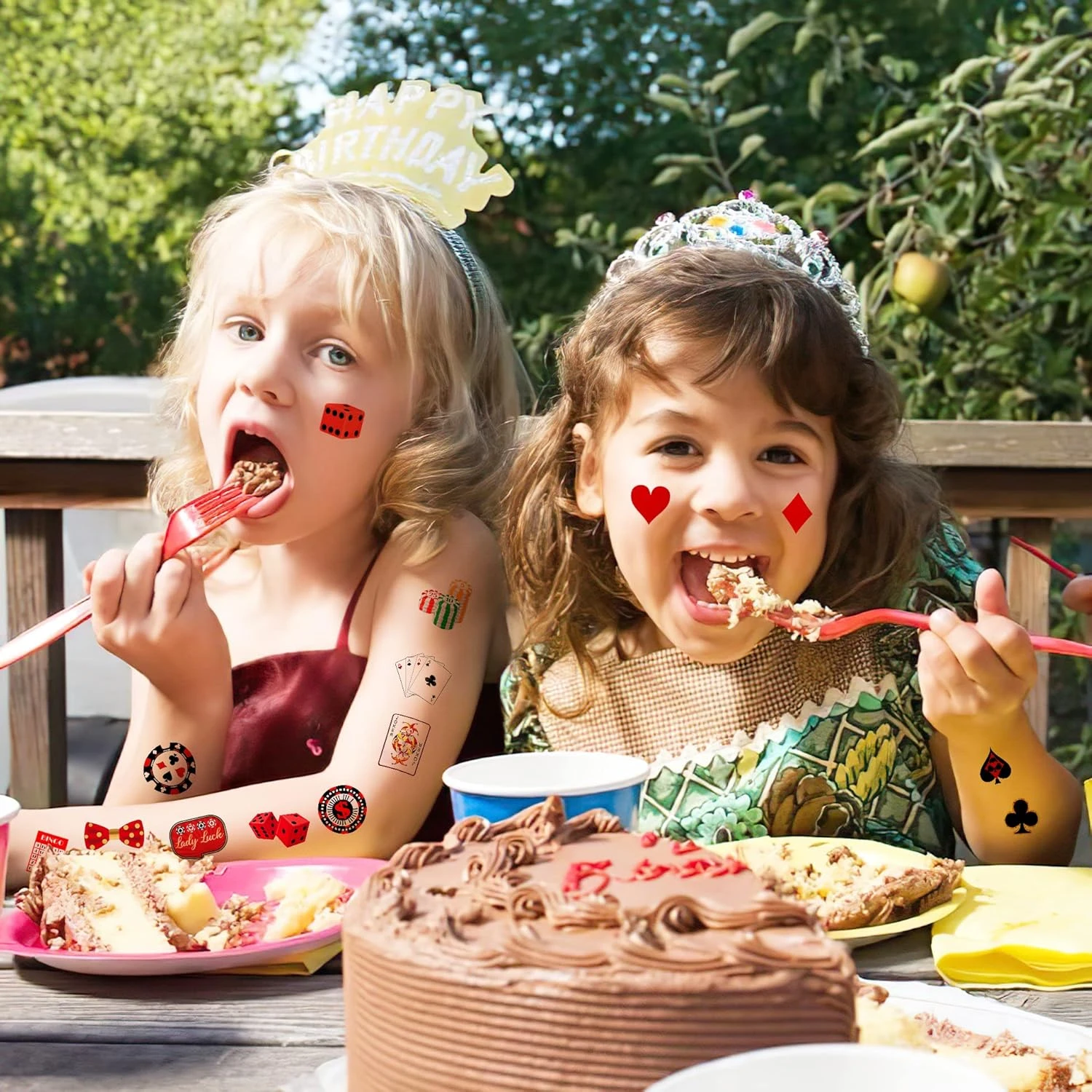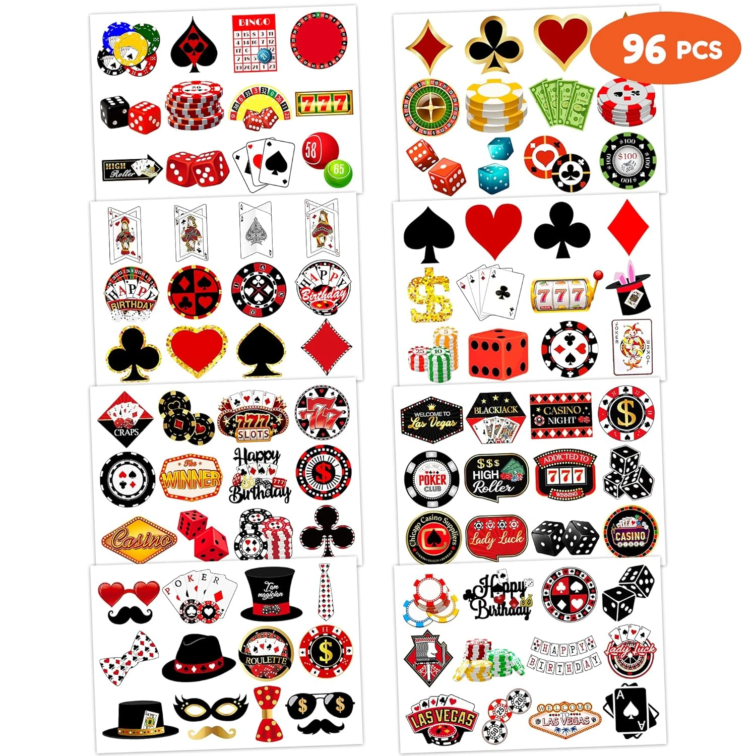 - Casino Party Supplies: 8 Sheets Casino temporary tattoos stickers, Have a variety of cartoon themed characters, Children can easily Casino stickers and take unique photos to make fond memories. The size of each sheet is 6.1 * 3.1 inches.