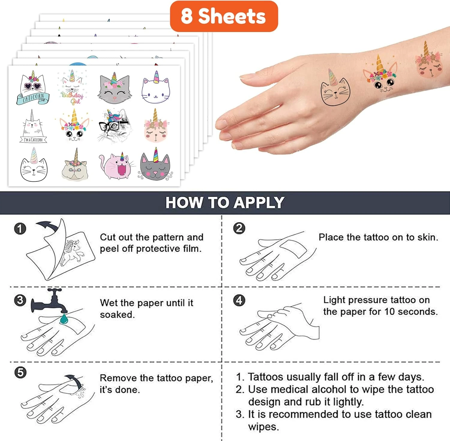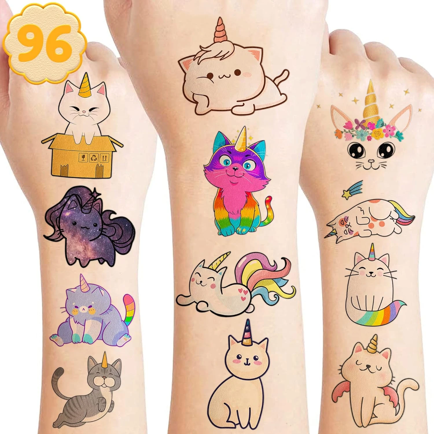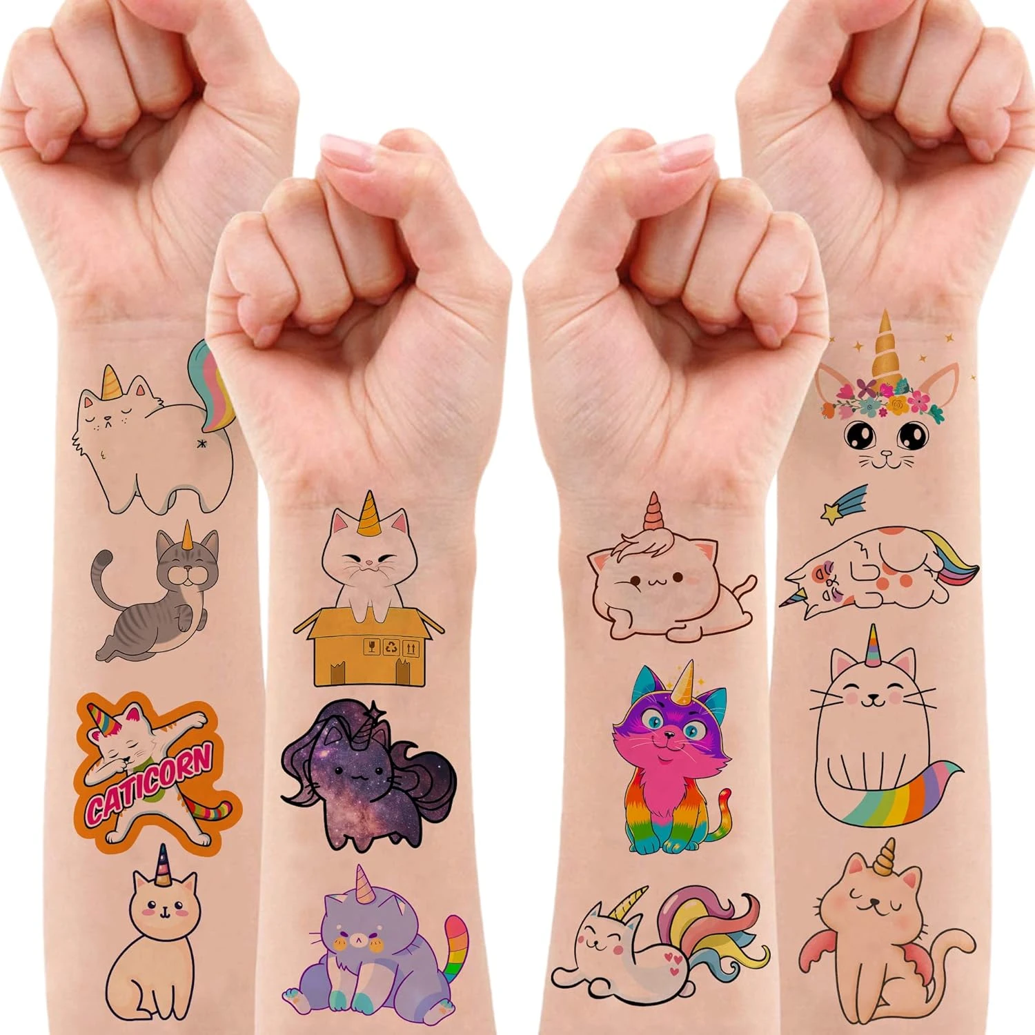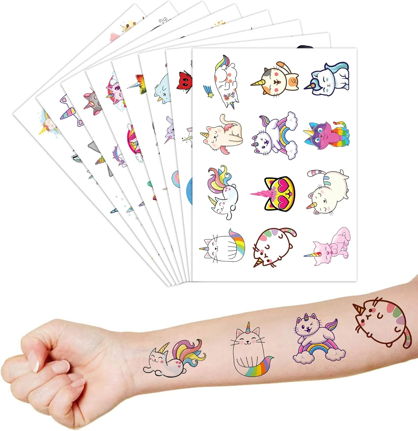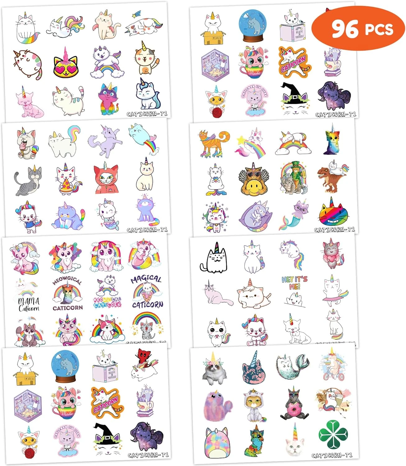 - 🐈 🦄【PERFECT TATTOOS FOR THEMED CATICORN DECORATIONS】: Caticorn temporary tattoo stickers include 8 sheets in total. There are 96Pcs super cute tattoo differences. Perfect for giving out party favors and holiday theme small gifts. The size of each sheet is 6.1 * 3.1 inches. One size fits kids.