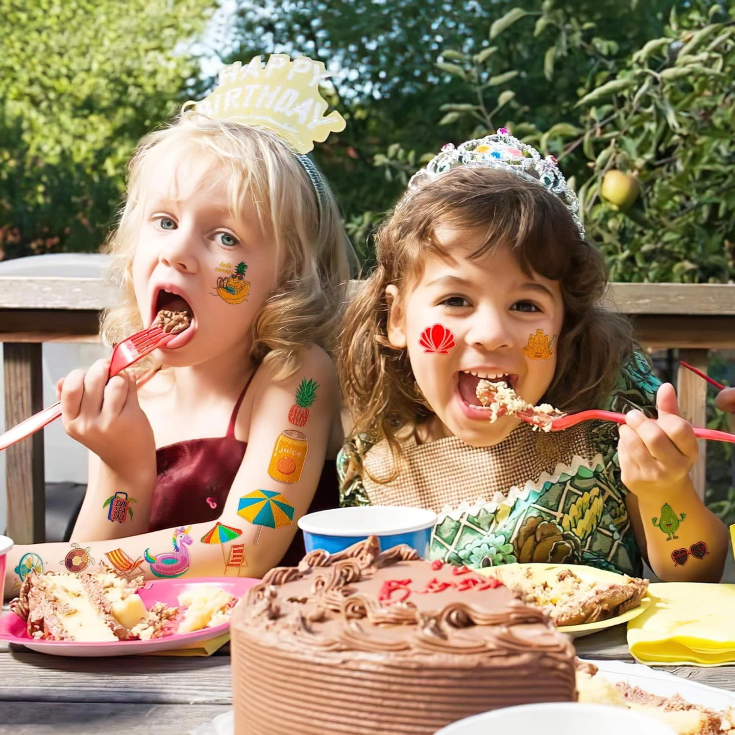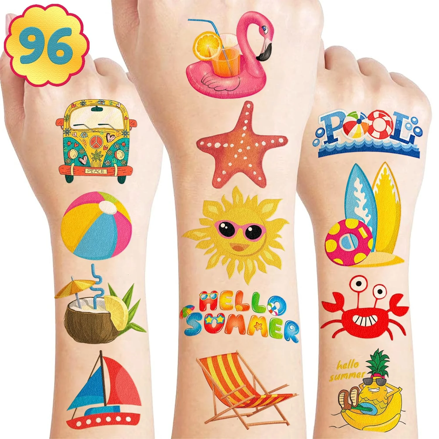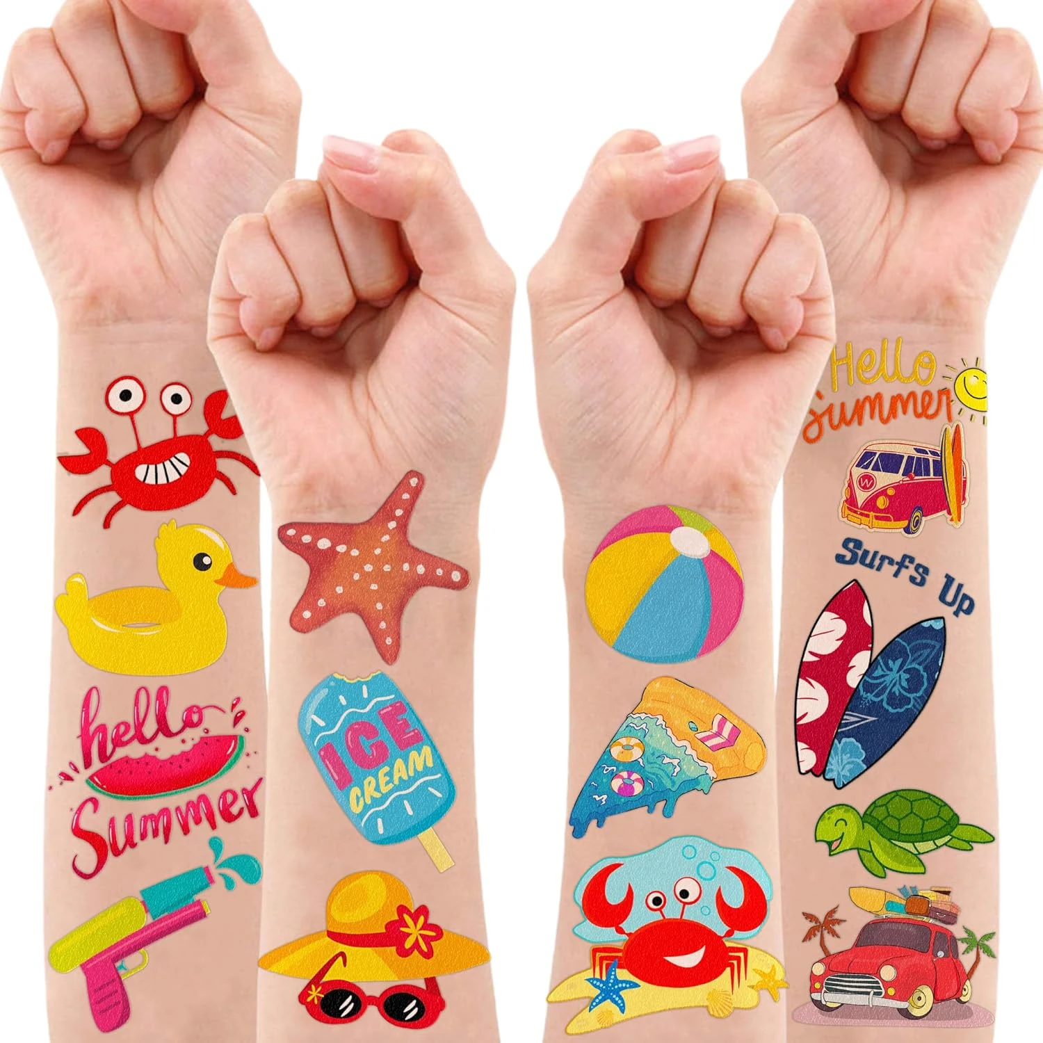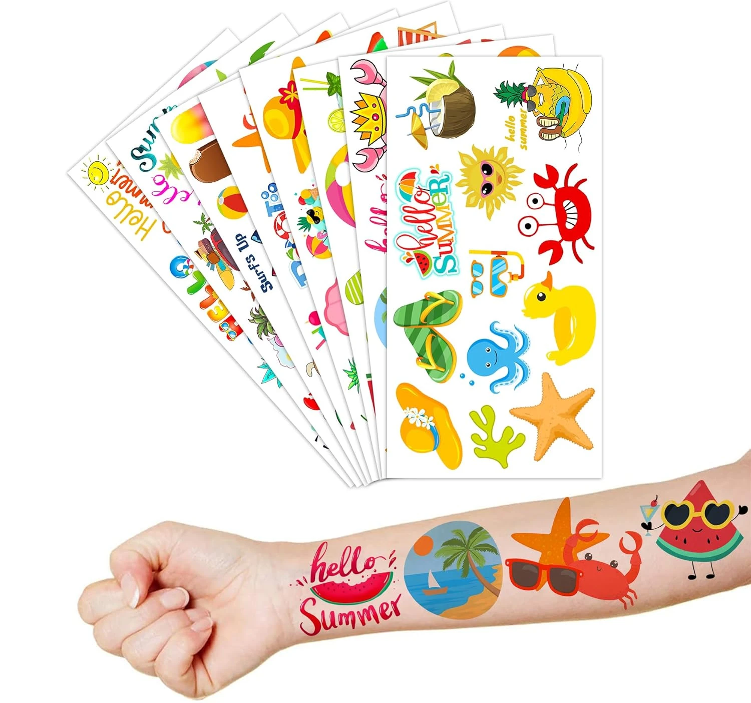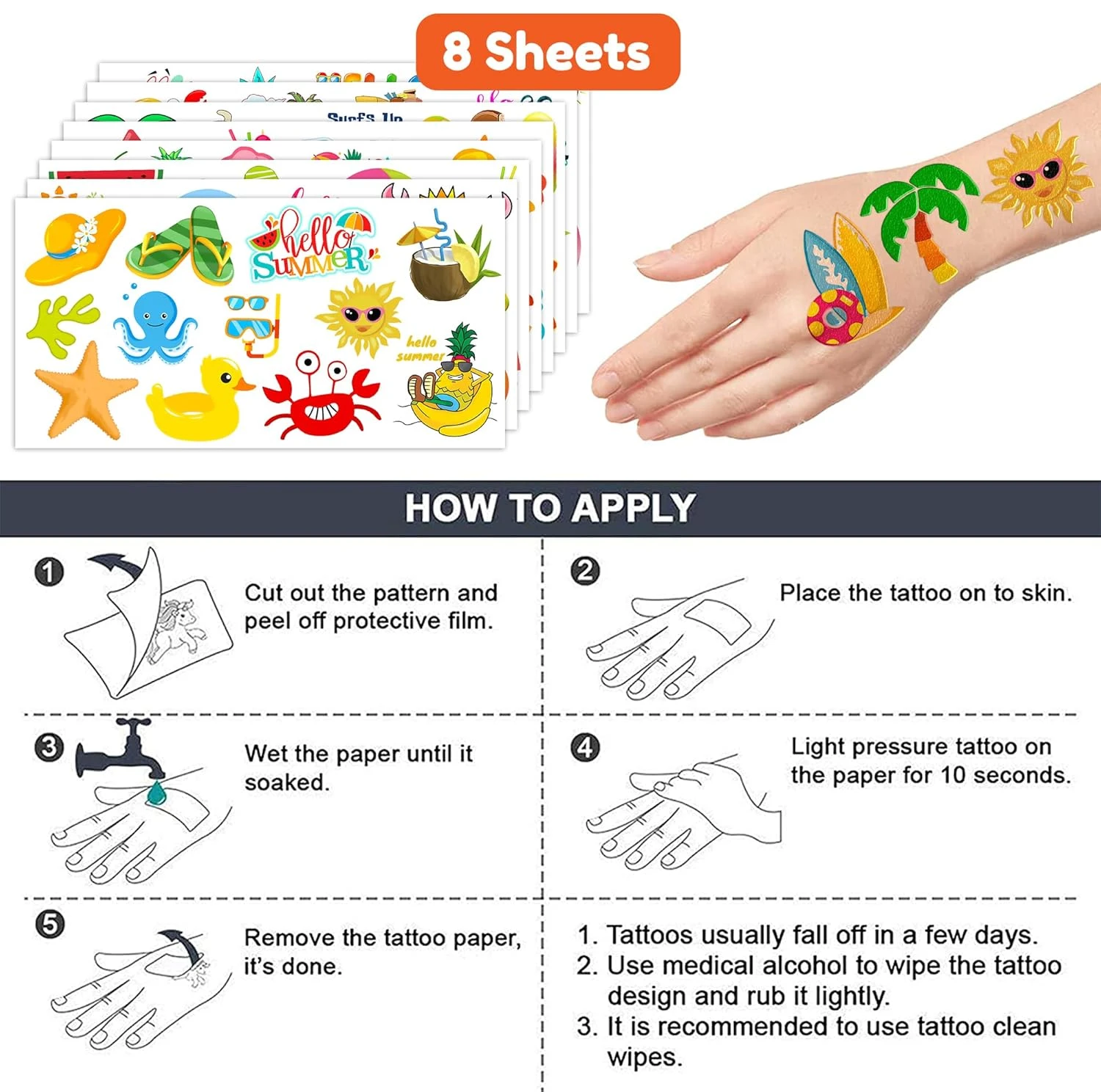 - The set of Summer temporary tattoos are made of high quality safety and green paper, Non-allergenic, and totally safe for your kid’s skin. Simply wet the tattoo with water and stick transferred them onto your body, hands, faces and arm you like, Tattoos will last 3-5 days, it also can be easily removed with baby oil, makeup remover or rubbing alcohol.