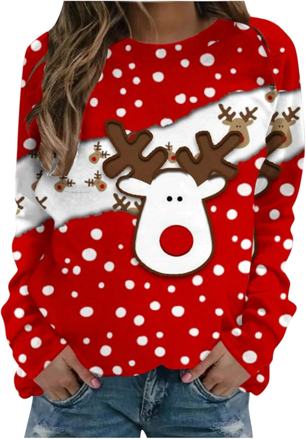 GENERIC Womens Red Christmas Sweatshirts 2023 Funny Deer Graphic Sweatshirt Ugly Christmas Shirts Thin Raglan Holiday Tops
