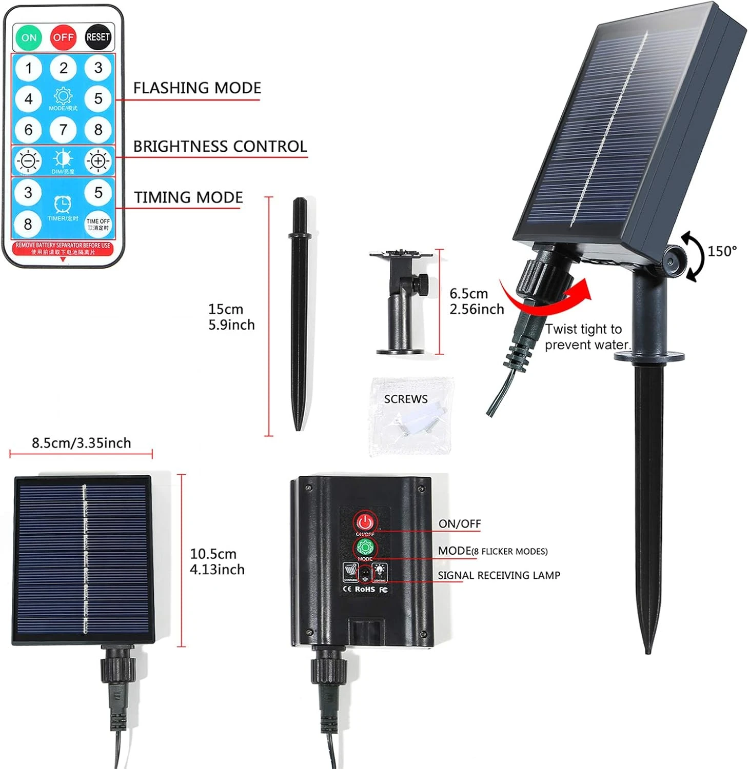 - 【Remote Control & Easy to Use】- Our solar outdoor lights has a multifunctional remote control for wireless operation.It can control power on/off,switch 8 lighting modes(Combination,In Waves,Sequential,Slo-Glo,Chasing/Flash,Slow Fade, Twinkle/Flash,Steady On), adjust brightness (25%, 50%, 75%, 100%) and set timer (3hrs, 5hrs, 8hrs, time off).Instead of press button on solar panel,you could use remote control to change mode easily.