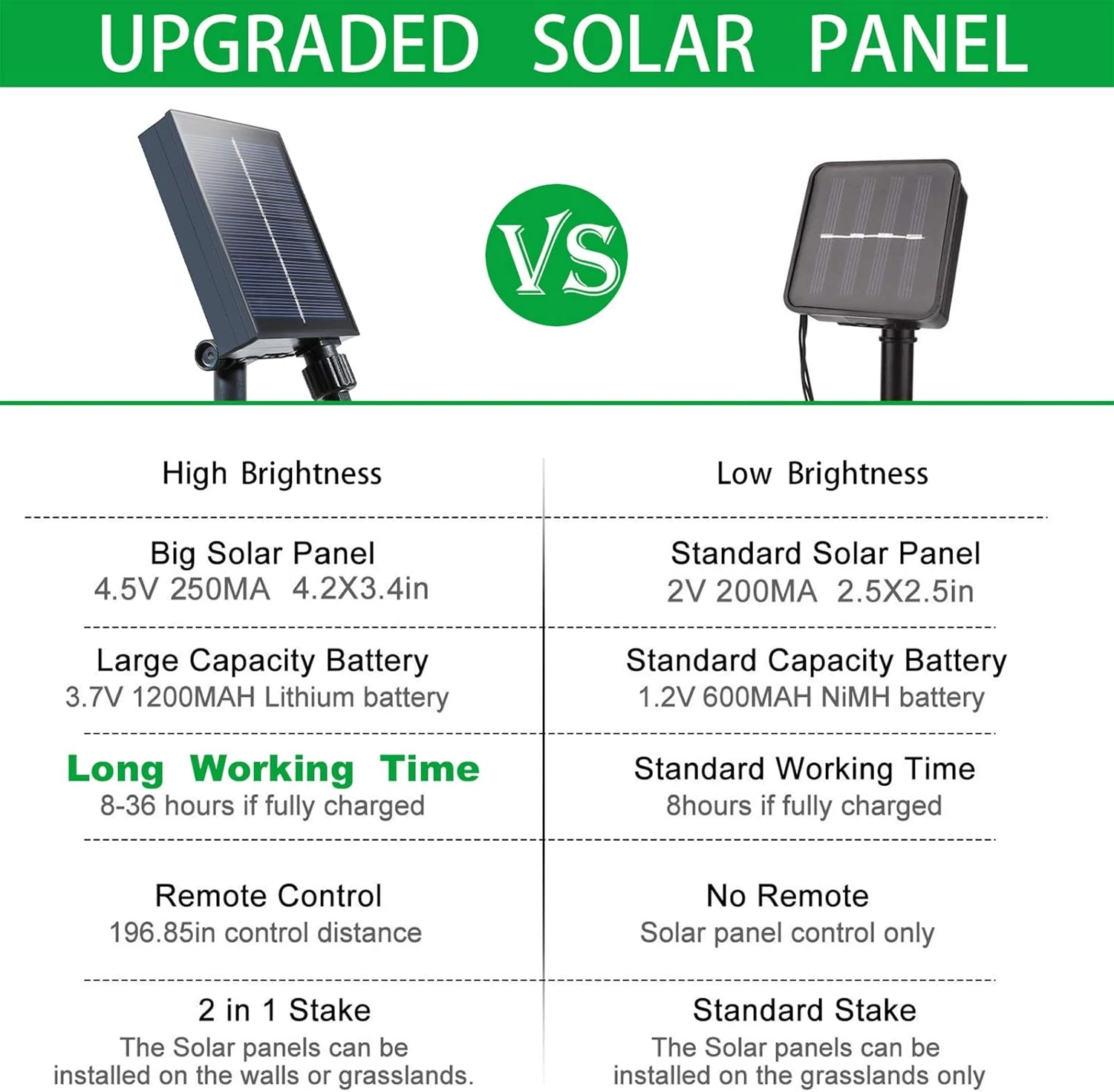 - 【Bigger Solar Panel/Battery & Auto on/off】- We updated the battery to1200mAh with high quality and bigger solar panel.No extra electric cost, solar powered only, and it can work 36 hours after fully charged(6-8 hours).This solar powered outdoor lights with auto sensor control,auto on at dark and auto off at daytime.