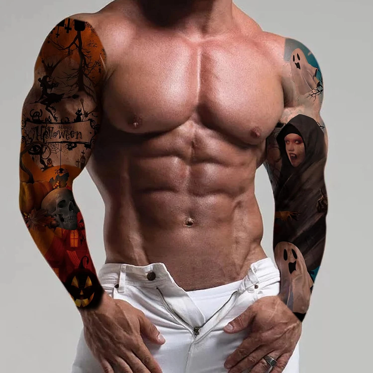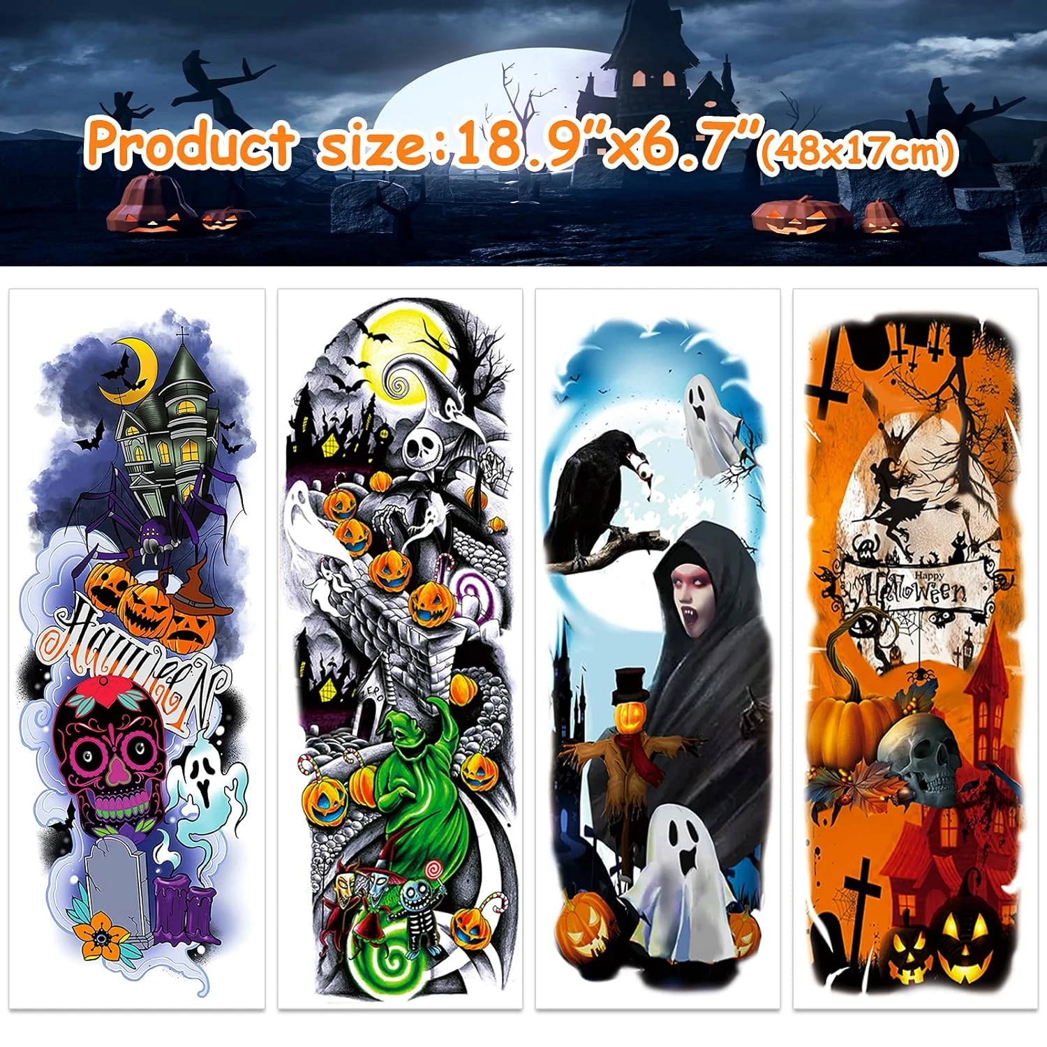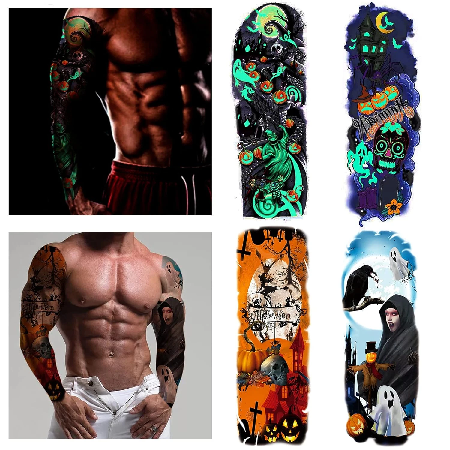 - Safe For All Skin Halloween Full Arm Sleeve Tattoo Bundle – 4 sheets extra large temporary arm sleeve tattoos which are measured dimension 7” x 19”.Include 2 Sheets Luminous Temporary Tattoo and 2 Sheets Temporary Tattoos, Great fun for Women, Men, Halloween,Party,Masquerade, decorations.