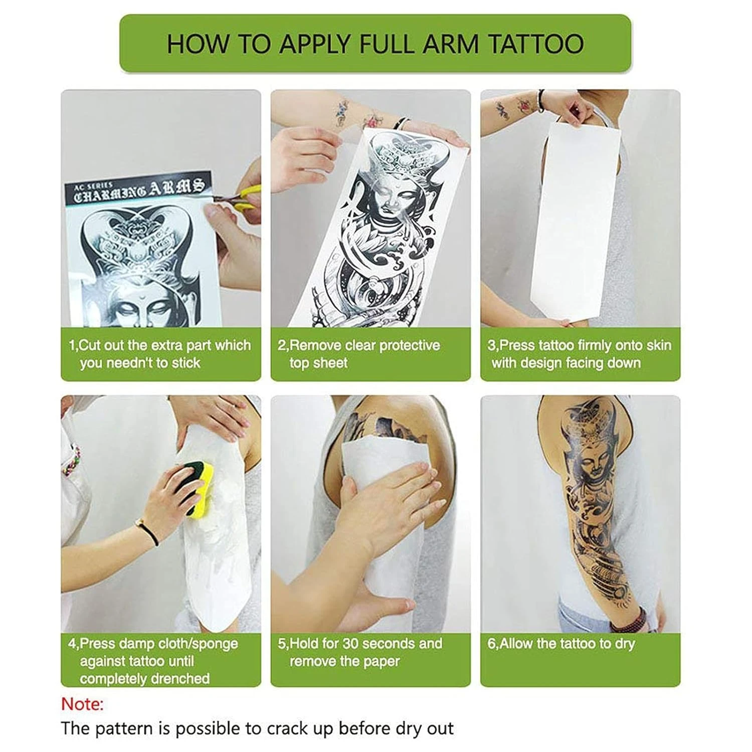 - Durable, Waterproof And Removable Sleeve Tatoo – long last for 3-5 days, depends on how many showers you take and how many times you scrub the tattoo with soap and water,Easy to apply in 10-20 seconds with just water and easily removed by rubbing alcohol, body oil, olive oil