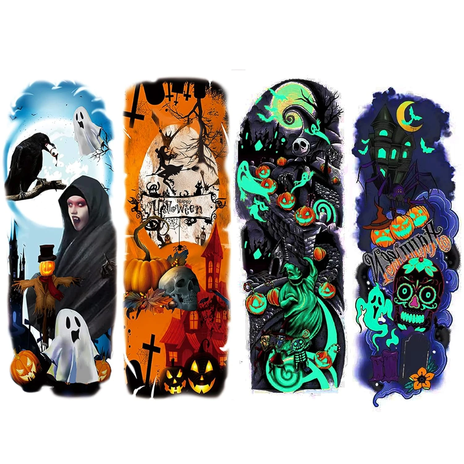 Halloween Full Arm Glow Temporary Tattoos, Nightmare Before Christmas Pumpkin Lantern Tumbler Luminous Tattoo Stickers For Men Women Makeup, 4-Sheet