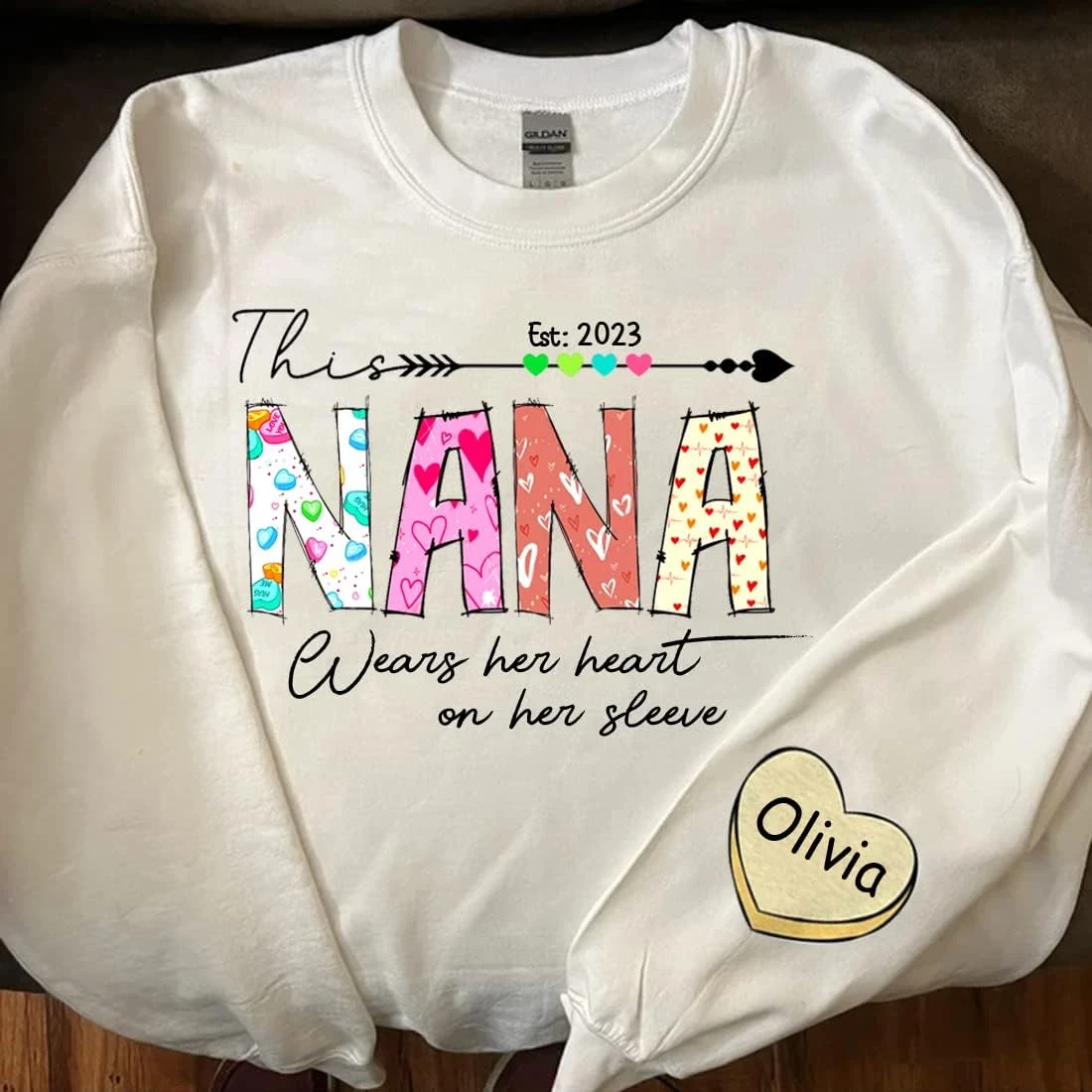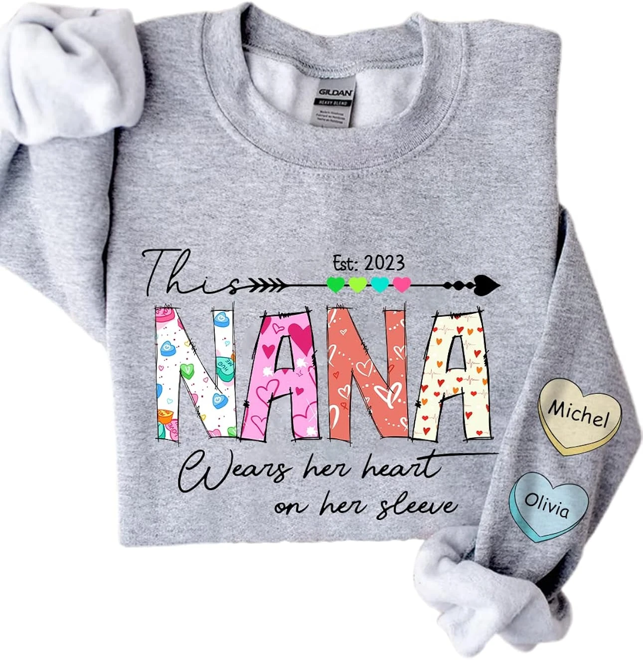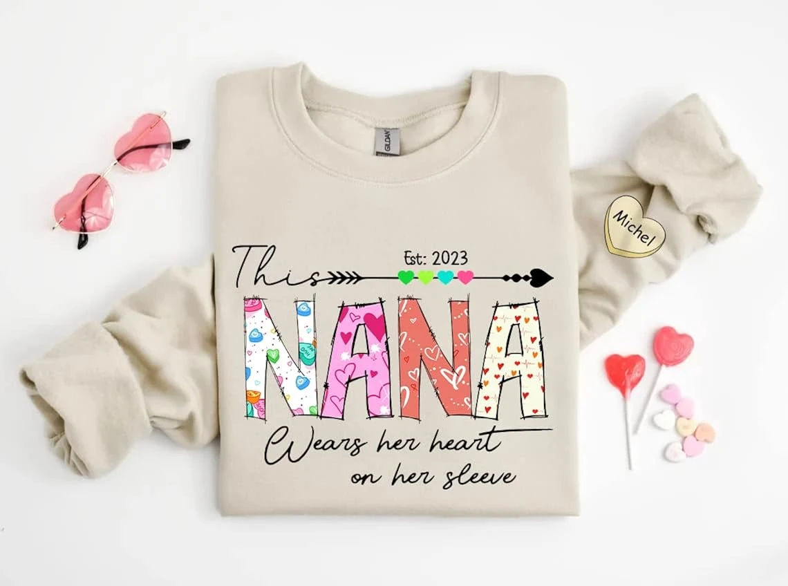 IZI POD Personalized Grandma Sweatshirt, This Nana Wears Her Heart On Her Sleeve, Nana Sweater, Valentines Gifts, Sweatshirt Nana, Mother’s Day Shirt, Christmas Shirt For Women
