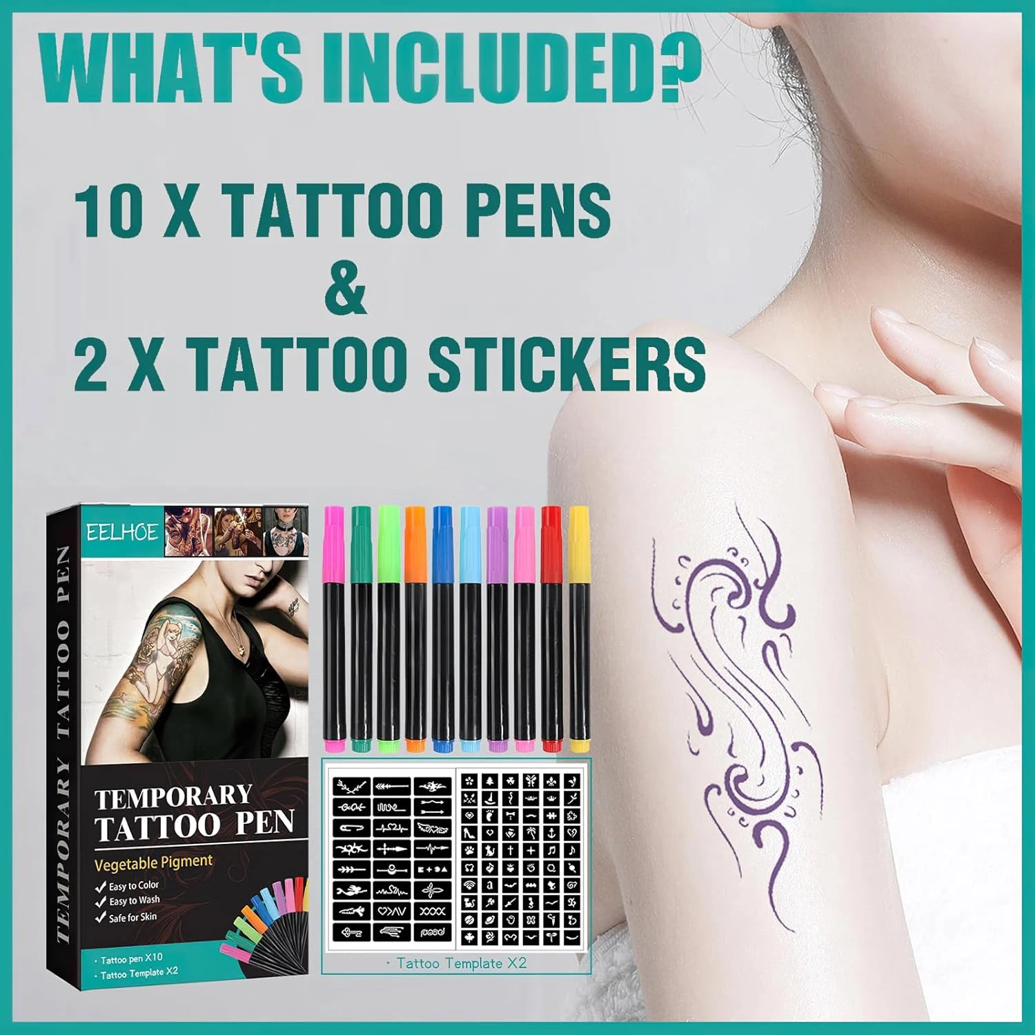 - TEMPORARY TATTOO KITS: Tattoo supplies include 10 tattoo markers in different colors and 2 tattoo stickers. Express your creativity with these high-quality and skin-friendly tattoo painting kits.