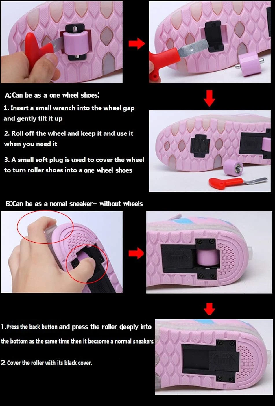 - ●Two wheels-feel like inline skates.the first wheel can be removel, as a single wheels shoes.You can hide the back wheel by pressing button at heels,it will becomes a normal sport shoes.