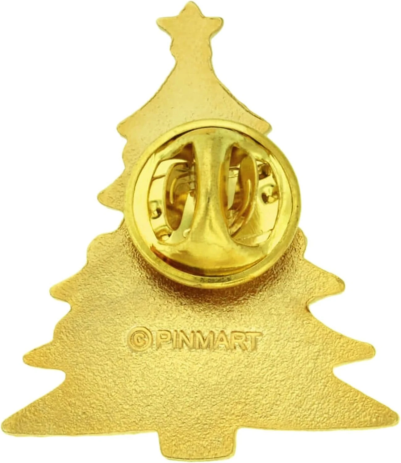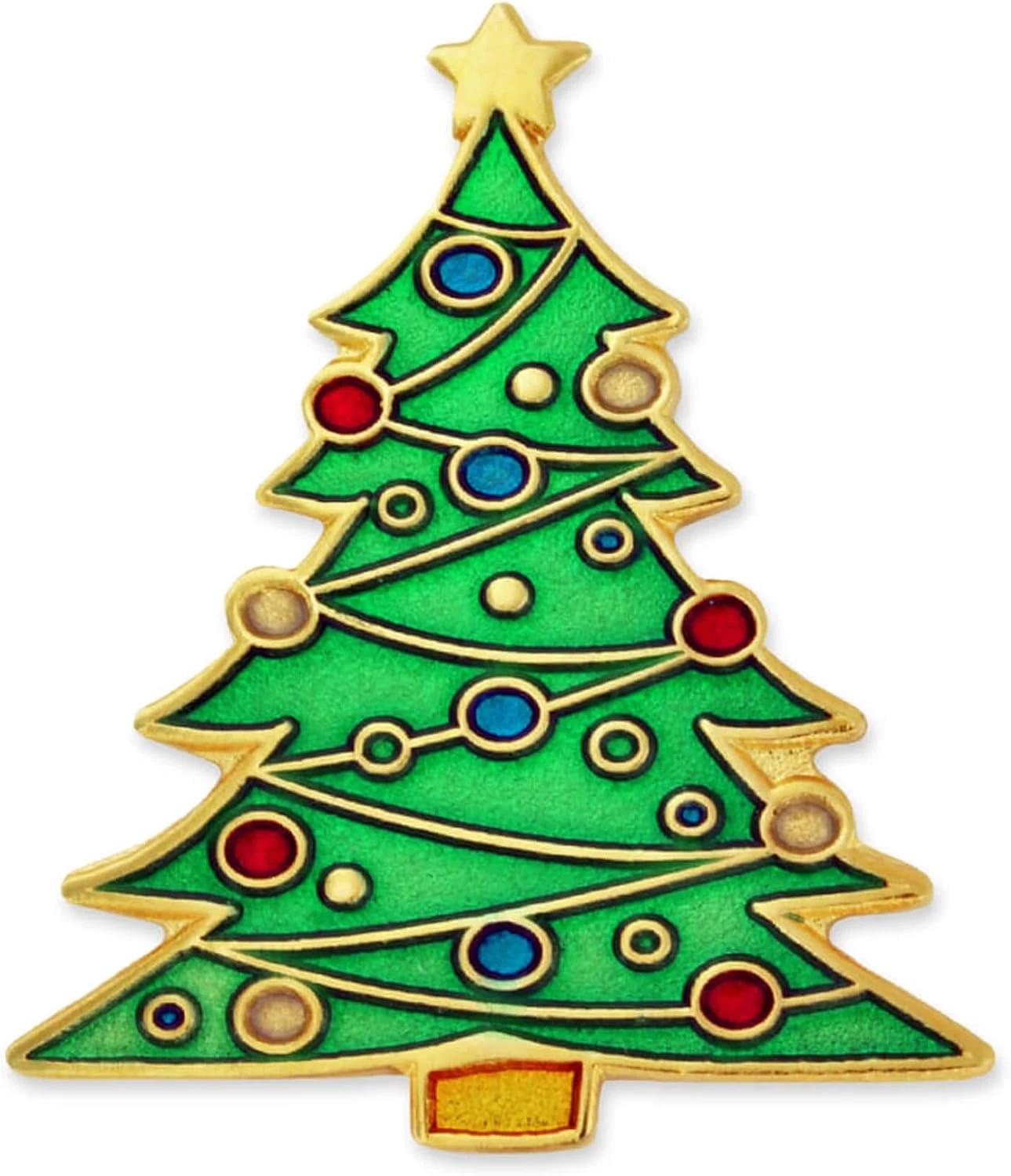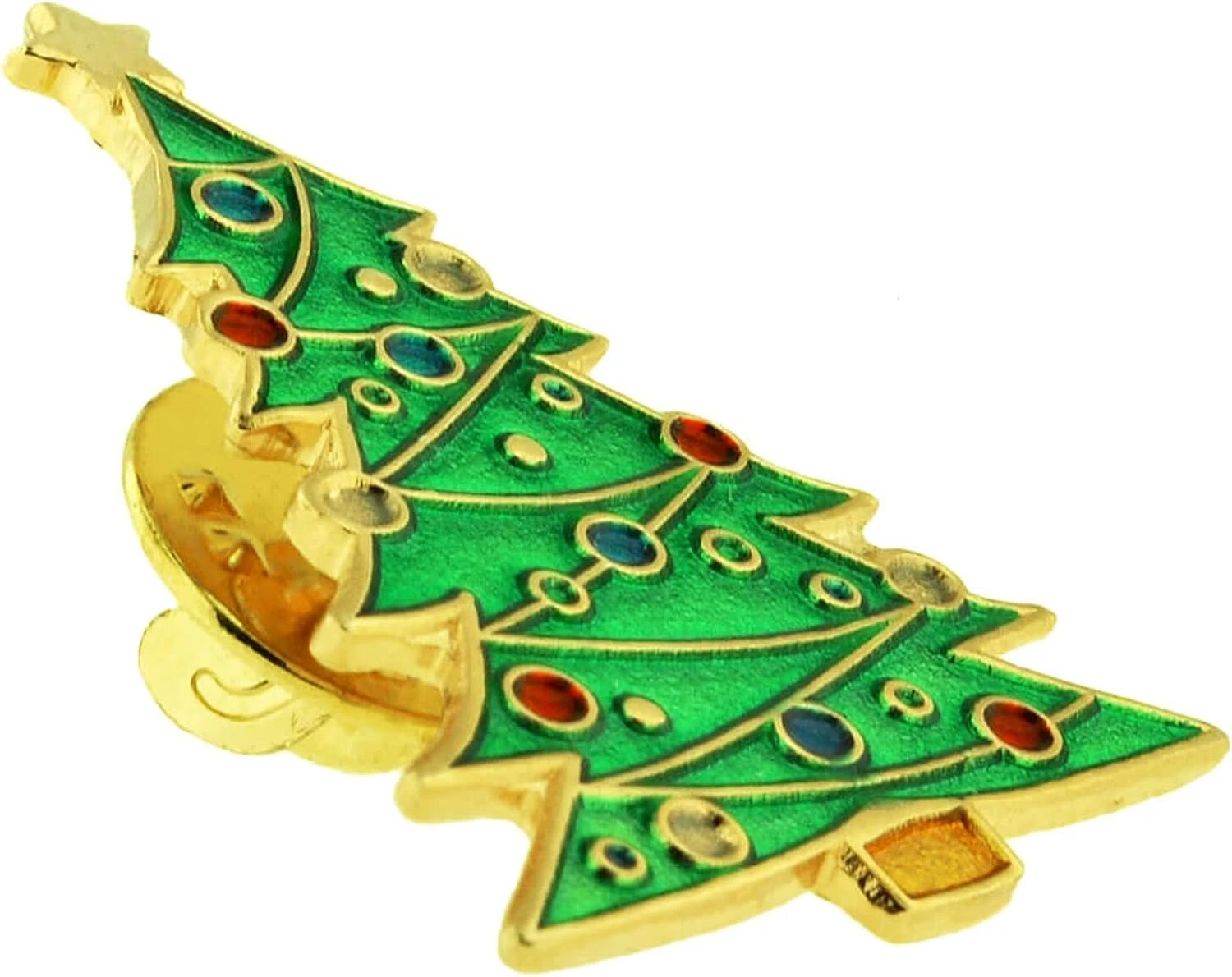 - This fun Christmas Tree lapel pin is die struck from jeweler’s metal, gold plated and hand filled with many brilliant transparent enamel colors. This current day design is a traditional hit; perfect for party favors, stocking stuffers and “quick gifts” for friends and colleagues.