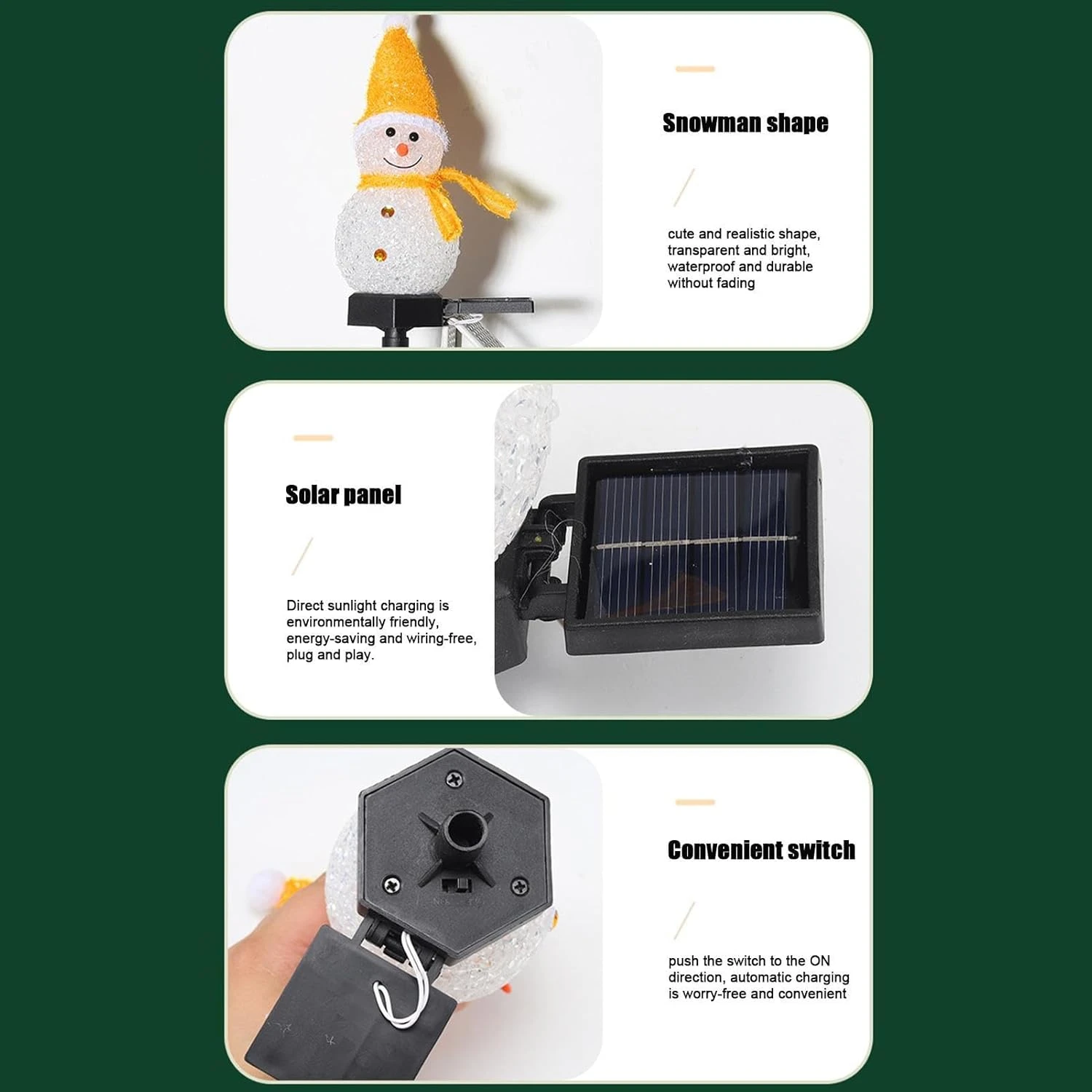 - ⇧Holiday Delight: Spruce up your home with snowman-shaped solar lights that automatically light up at night. The built-in lithium battery and solar panel make them energy-efficient. With easy installation, they can perfectly add a charming touch to your festive decor.