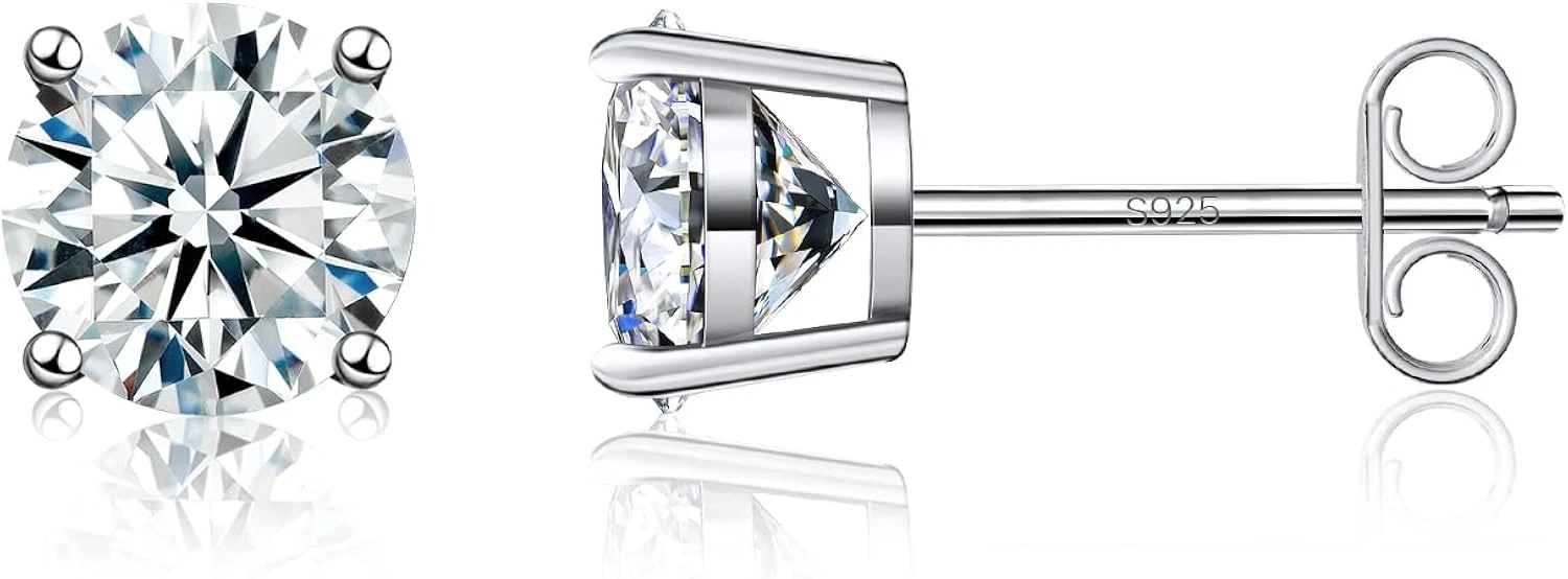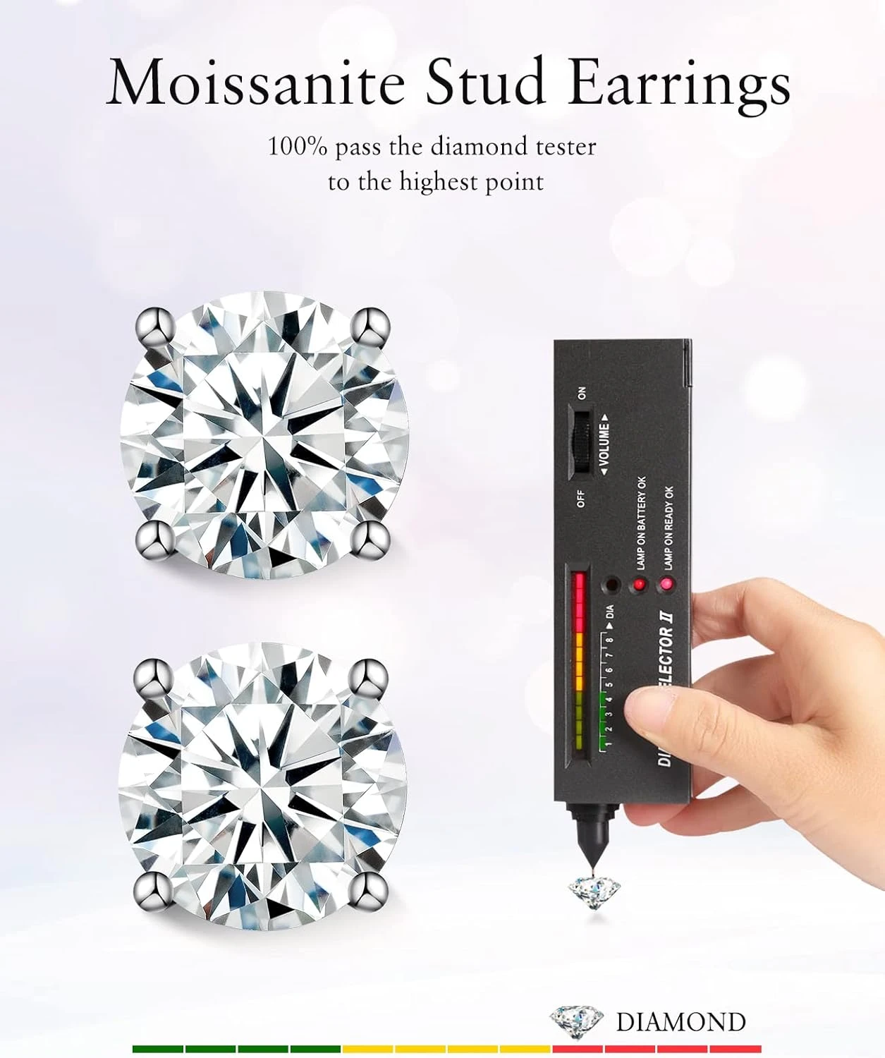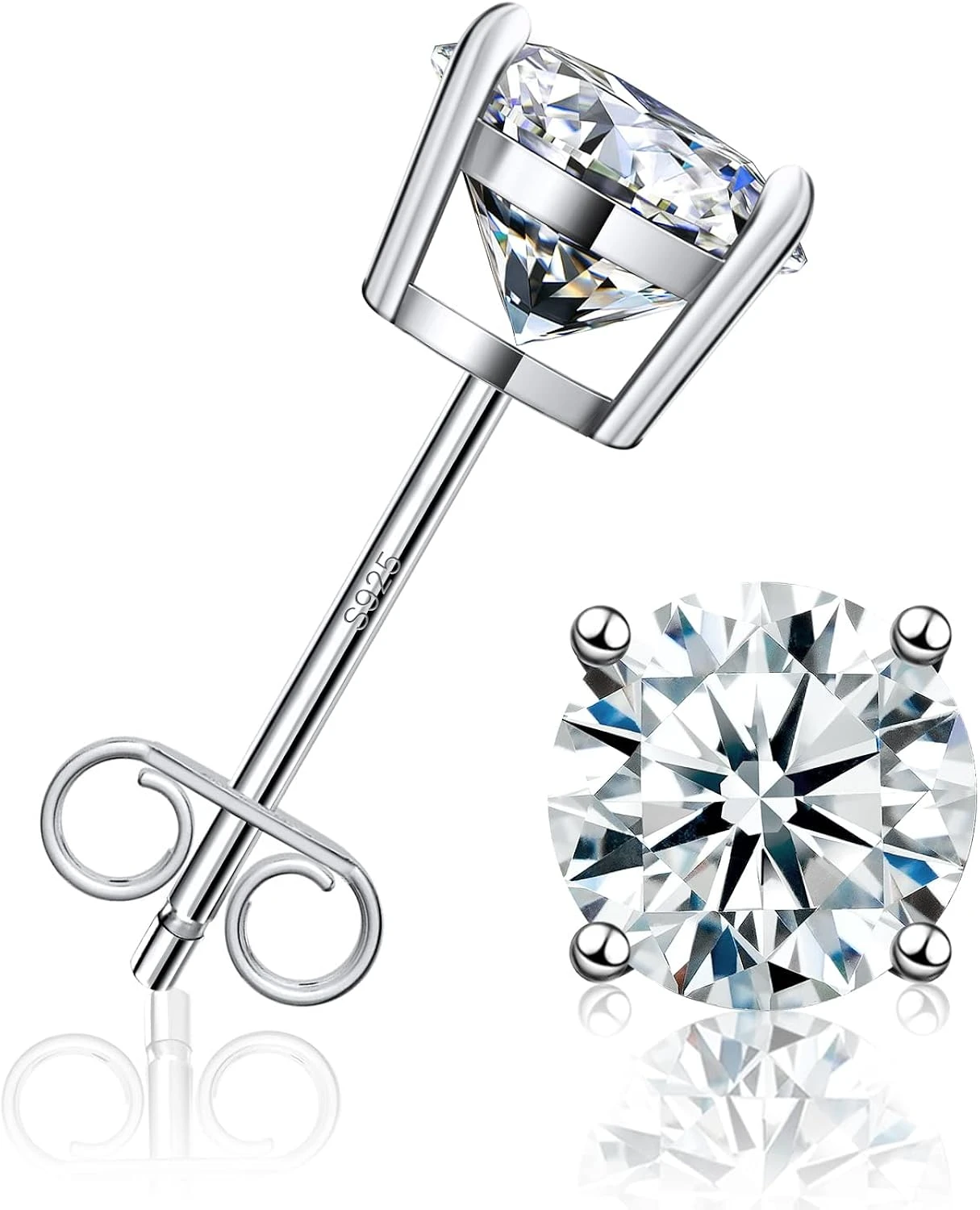 Stud Earrings For Women Men Girl, FCINOS 18K White Gold Plated S925 Sterling Silver 1/2/4 CT D Color VVS1 Clarity Round Cut Moissanite Lab Created Diamond Earrings Promise Birthday Christmas Gift
