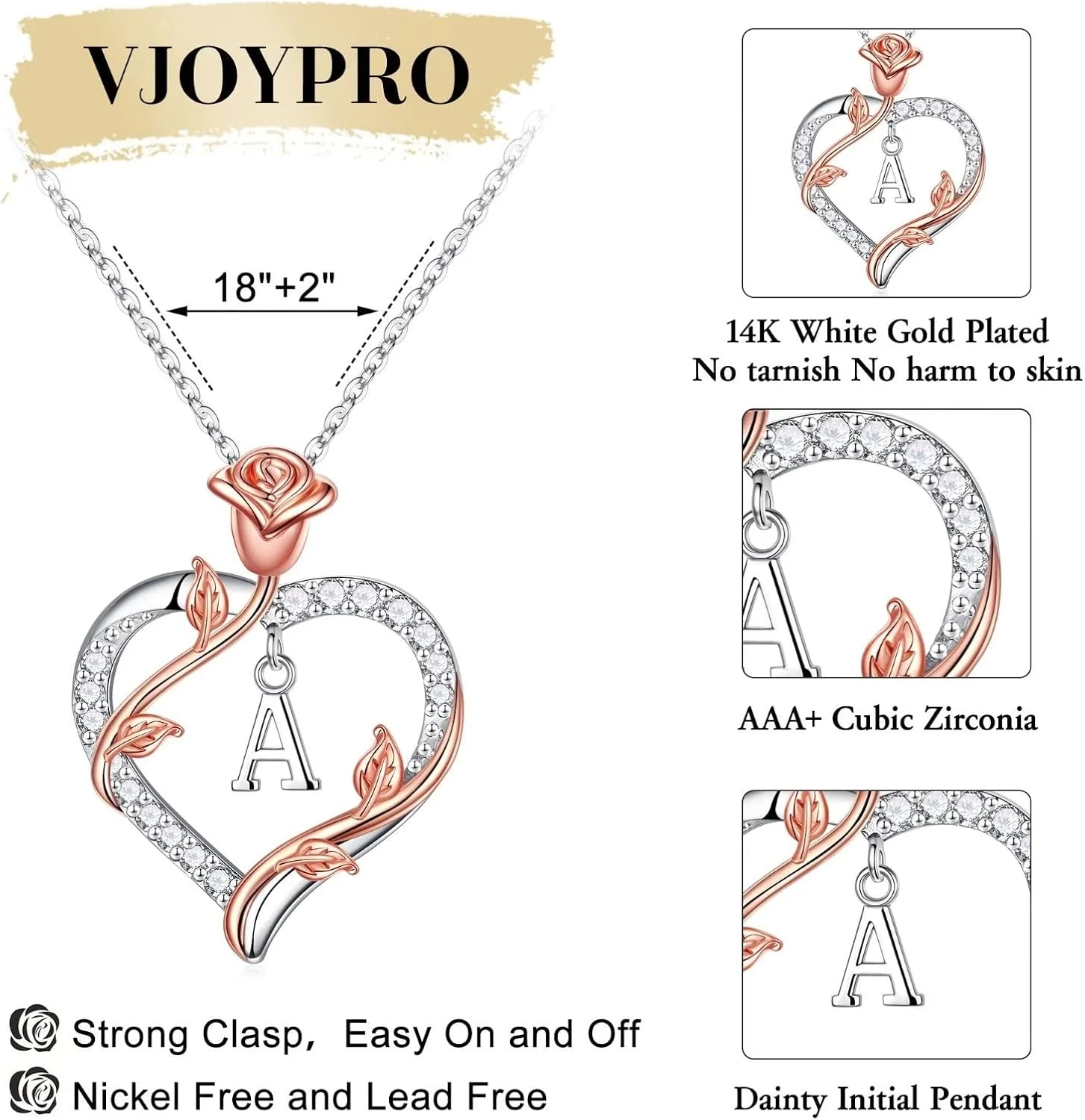 Vjoypro Rose Heart Initial Necklace Gifts For Women Girls, Letter Pendant Necklaces For Women Jewelry Anniversary Birthday Gifts Christmas Valentines Day Gifts For Her Wife Girlfriend Teen Girls