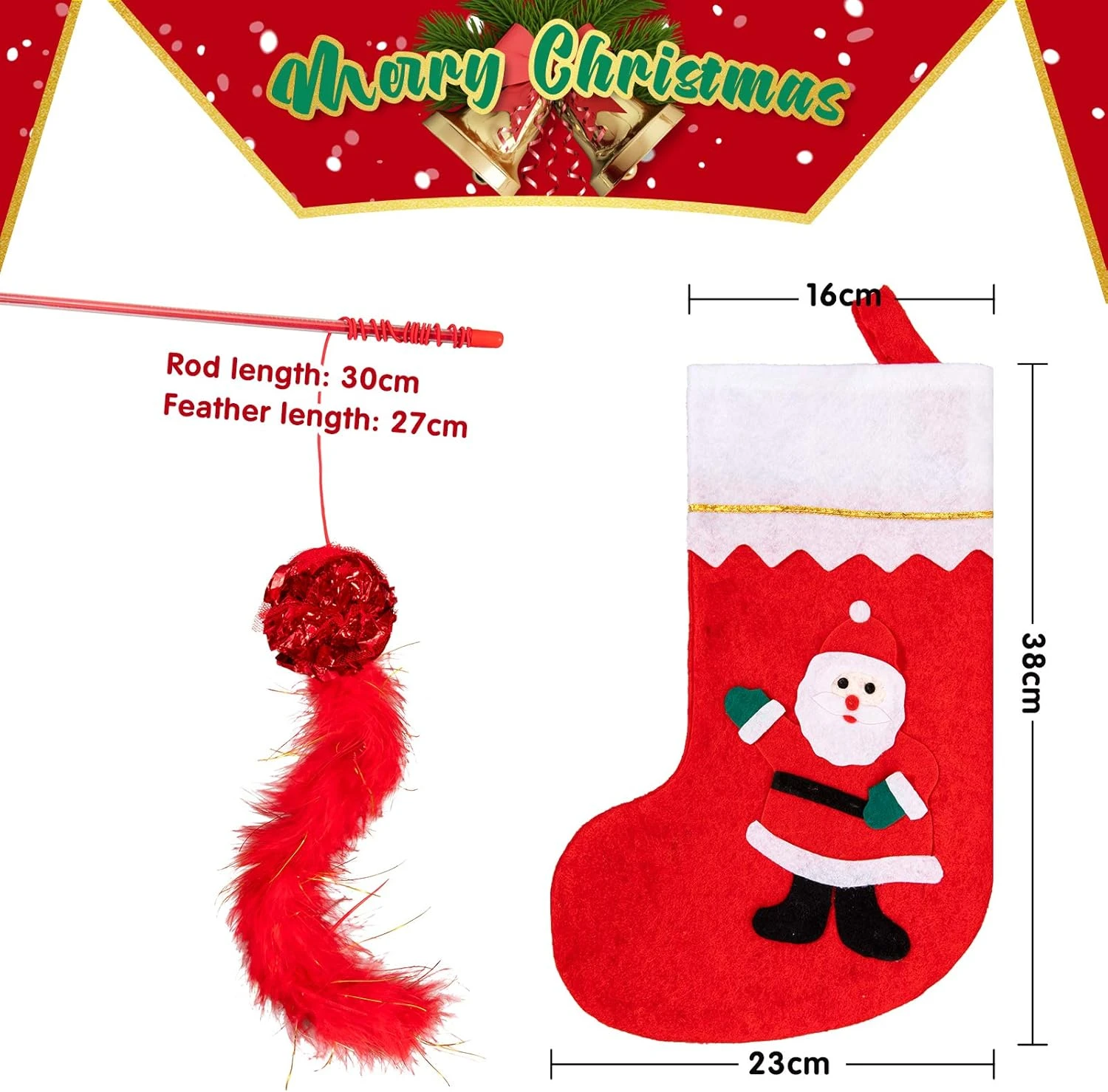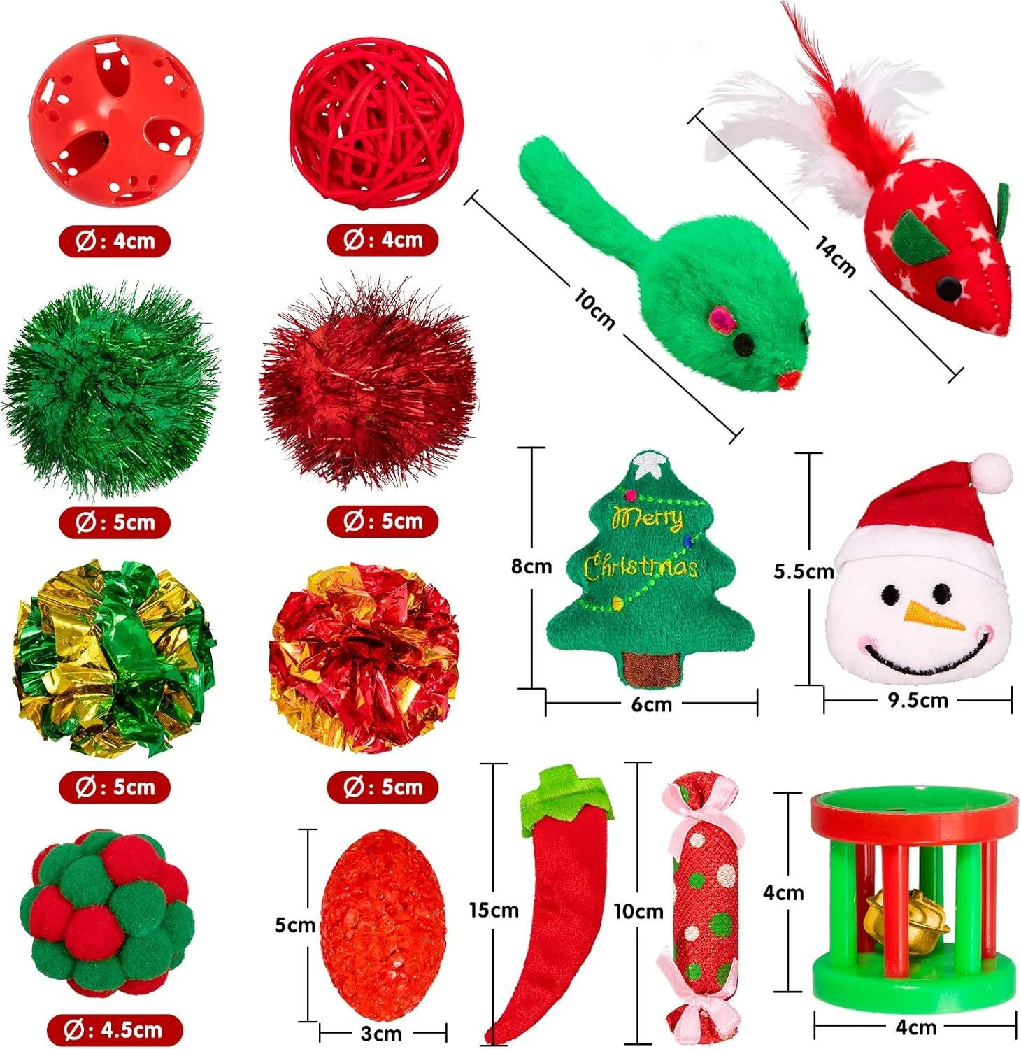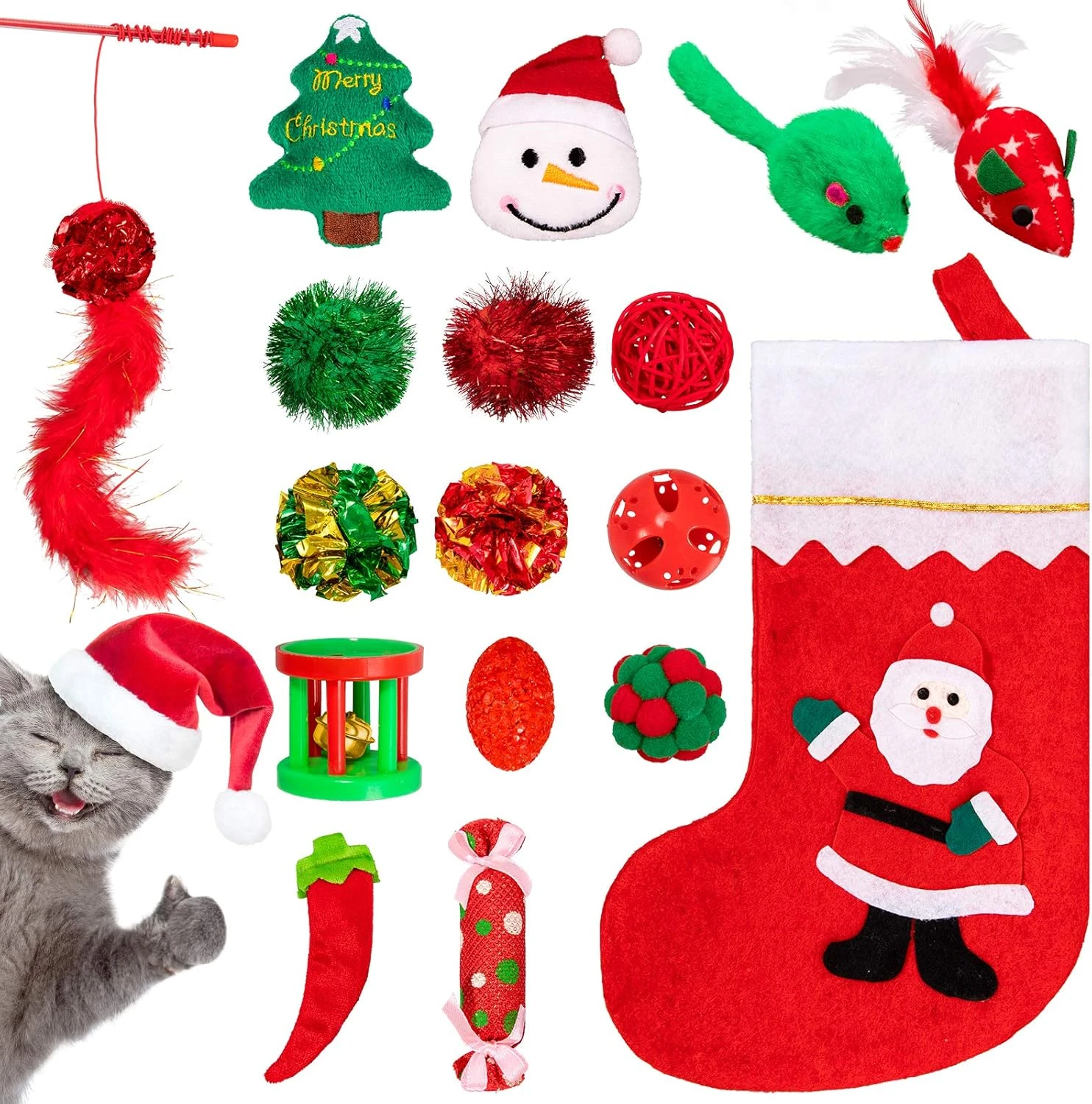 Whaline 17pcs Christmas Cat Toys Stocking Cat Stick 7 Cat Playing Balls Roller Bell 2 Mice Plush Snowman Plush Pepper Plush Christmas Tree Xmas Candy Pompoms Training Supplies For Pet