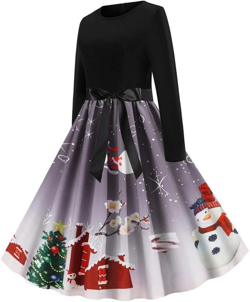 WUAI Women Christmas Dress Plus Size Vintage Santa Claus Snowflake Patterns Evening Prom Costume Swing A-Line Dress